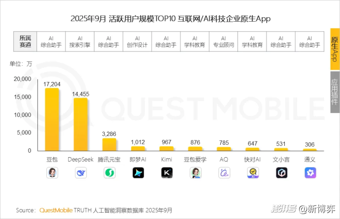 2025年12月,據(jù)36氪消息稱,豆包的日活用戶已經突破1億。在此之前,QuestMobile發(fā)布的2025年三季度AI應用行業(yè)報告數(shù)據(jù)顯示,豆包以1.72億月活反超DeepSeek(1.44億)登頂。