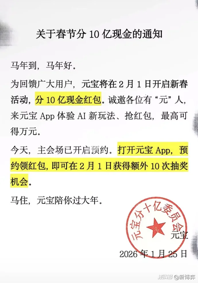 首先是其屢試不爽的春節(jié)紅包玩法。1月25日,騰訊旗下AI應用元寶發(fā)布公告,將在2月1日開啟新春活動,用戶上元寶App即可參與搶10億現(xiàn)金紅包,其中單個紅包金額最高可達1萬元。騰訊對此頗為重視,隨后的年會上,馬化騰表示希望此次活動能重現(xiàn)當年微信紅包的盛況。