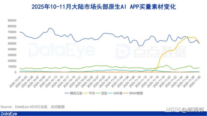 另一方面,作為C端市場的后來者,阿里迅速選擇以投流換增量的打法驅動用戶增長。DataEye研究院旗下的ADX行業(yè)版數(shù)據(jù)顯示,自2025年11月起,千問的買量數(shù)據(jù)迅速攀升至與元寶不相上下的位置。受此帶動,千問上線一個月,月活用戶便達到4000萬,漲勢兇猛。