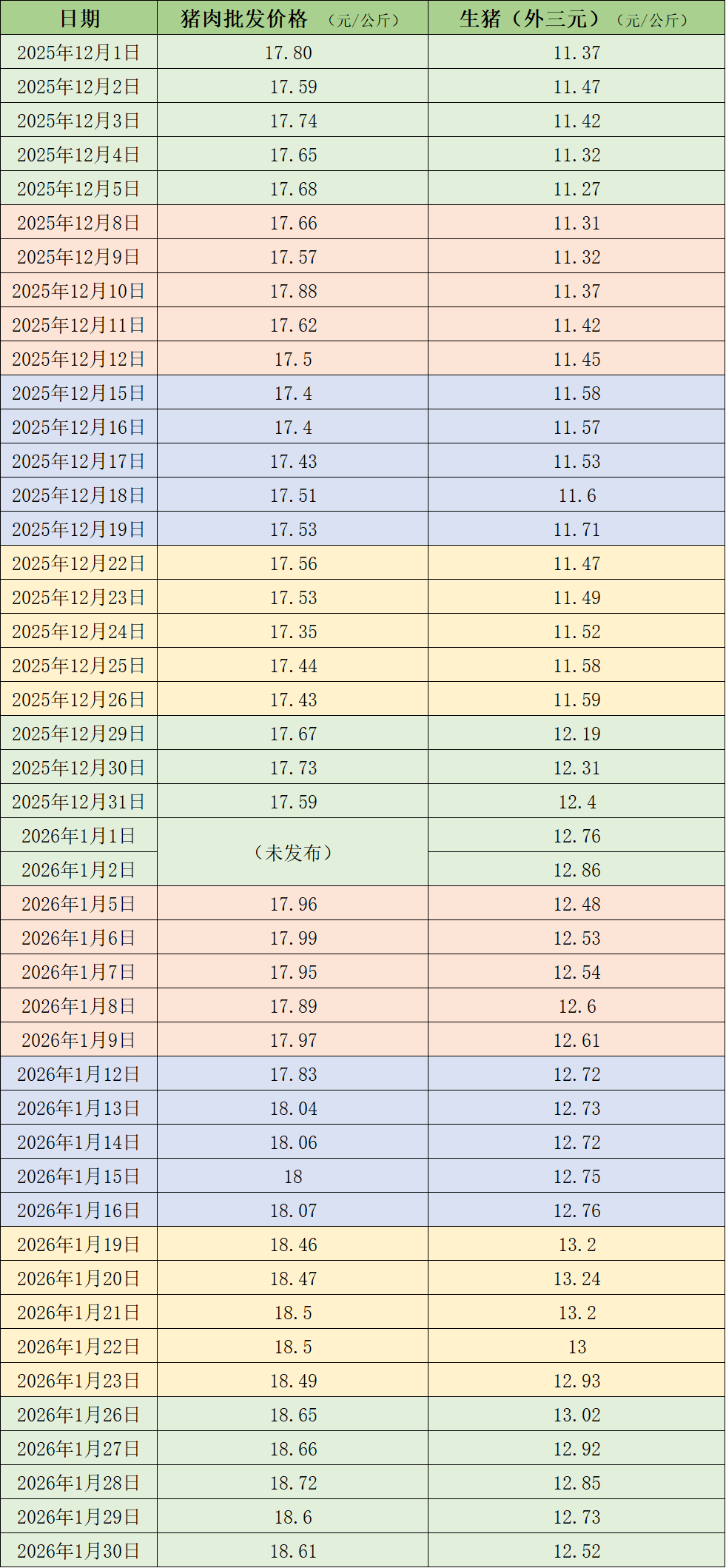 據(jù)農(nóng)業(yè)農(nóng)村部監(jiān)測,1月30日,全國農(nóng)產(chǎn)品批發(fā)市場豬肉平均價格為18.61元/公斤,與上周五(1月23日)的18.49元/公斤相比,上漲0.6%。本周的平均價格為18.65元/公斤,與上周18.5元/公斤的均價相比,上漲0.8%。