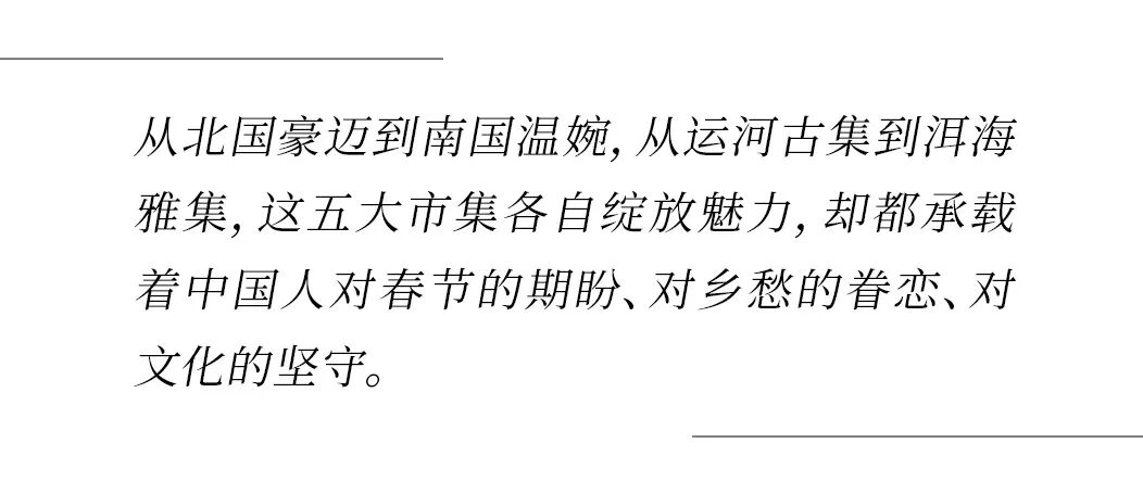 從北國豪邁到南國溫婉,從運河古集到洱海雅集,這五大市集各自綻放魅力,卻都承載著中國人對春節(jié)的期盼、對鄉(xiāng)愁的眷戀、對文化的堅守。春節(jié)腳步漸近,市集煙火愈濃,愿每一個逛集人,都能在琳瑯年貨中尋得心儀之物,在熱鬧氛圍中感受濃濃年味,帶著煙火溫情,奔赴新春團圓。
