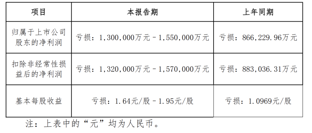 公告顯示,2025年預(yù)計(jì)歸屬于上市公司股東的凈利潤(rùn)虧損約130億元-155億元,2024年同期虧損約86.6億元;扣除非經(jīng)常性損益后的凈利潤(rùn)虧損約132億元-157億元,2024年同期虧損約88.3億元。