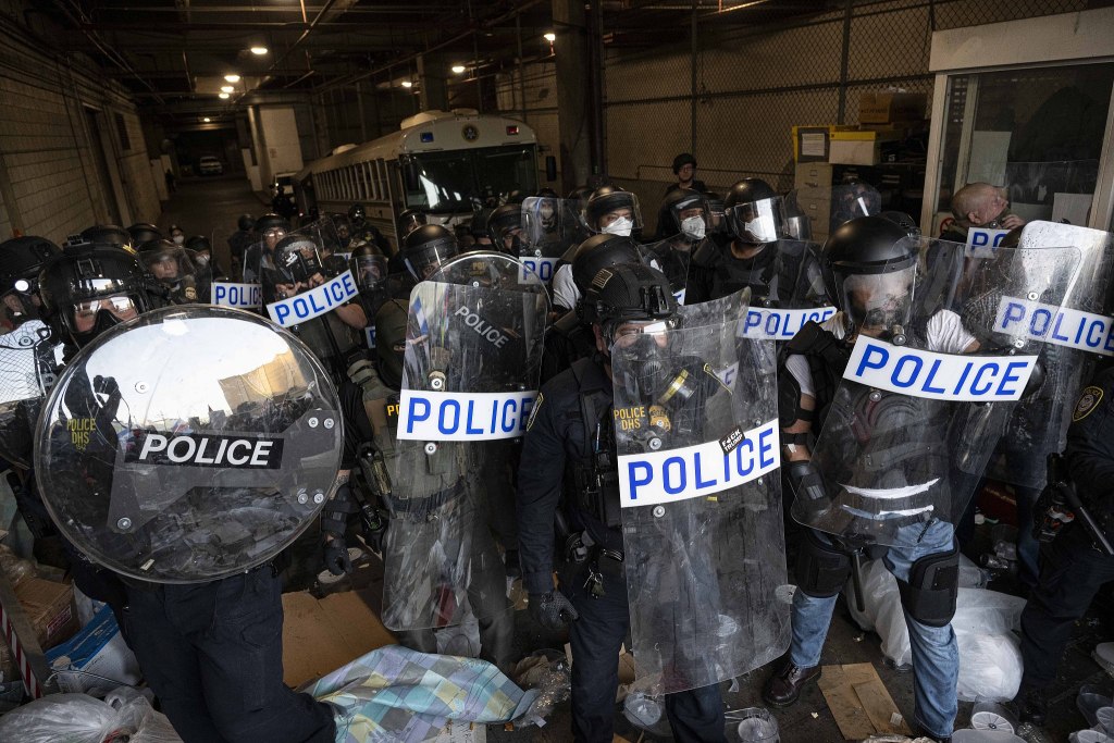 當(dāng)?shù)貢r(shí)間2026年1月30日,美國(guó)加利福尼亞州洛杉磯市中心,洛杉磯警察局(LAPD)警員驅(qū)散示威者。視覺中國(guó) 圖