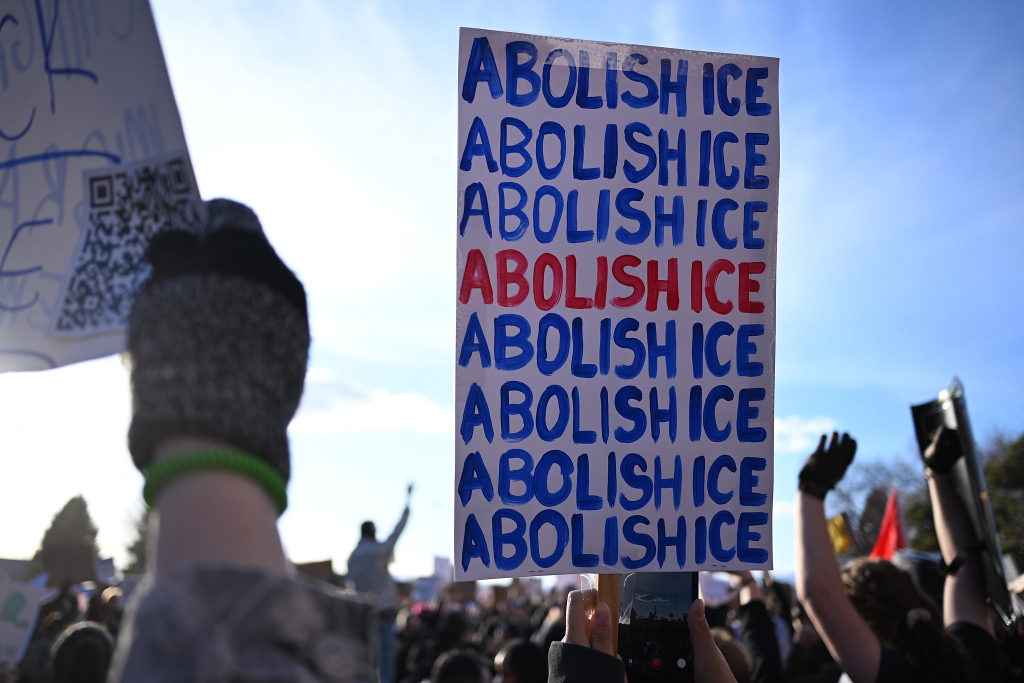 當(dāng)?shù)貢r(shí)間2026年1月30日,美國(guó)科羅拉多州丹佛,示威者手持寫有“廢除ICE”的標(biāo)語(yǔ),參加抗議美國(guó)移民與海關(guān)執(zhí)法局(ICE)暴力執(zhí)法的示威活動(dòng)。視覺中國(guó) 圖
