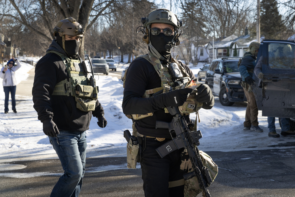 當(dāng)?shù)貢r(shí)間2026年1月31日,美國(guó)明尼蘇達(dá)州圣保羅,聯(lián)邦移民執(zhí)法人員在執(zhí)行逮捕任務(wù)時(shí),進(jìn)行現(xiàn)場(chǎng)警戒。視覺中國(guó) 圖