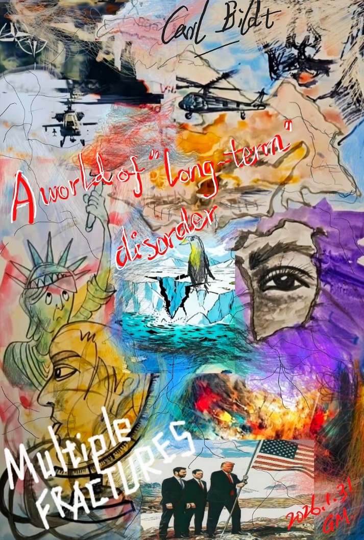 圖1 我們正在進(jìn)入一個(gè)“長期失序”的世界 紙本彩墨+手機(jī)手繪+拼貼 65cm X 45cm 李公明 作 2026年1月31日