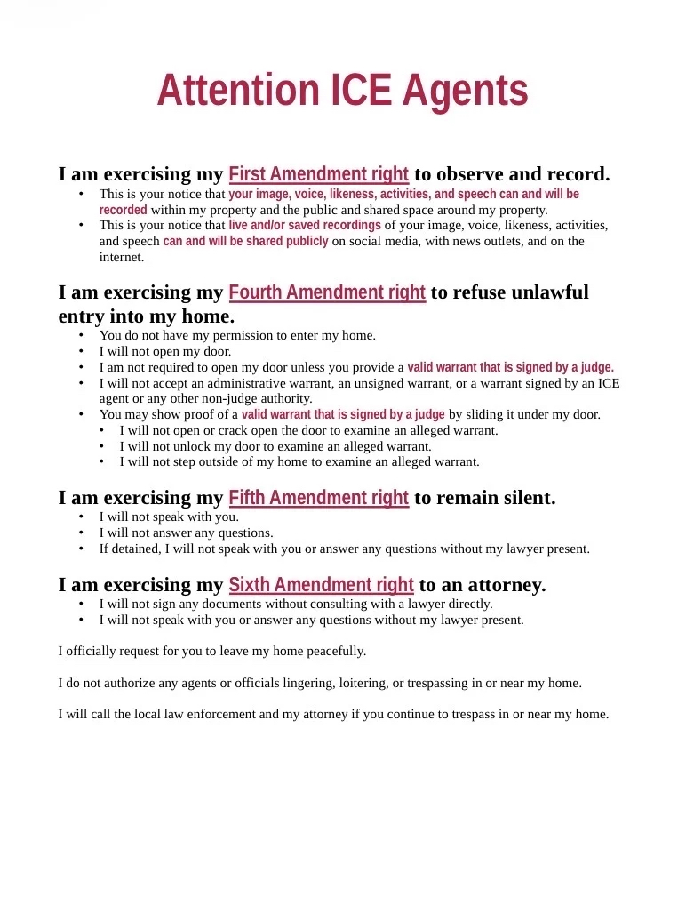 艾莉制作的英文傳單,以便應(yīng)對(duì)ICE上門查訪。