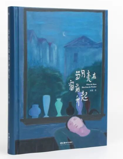 《當(dāng)月亮在窗前升起》是一本函套精裝書,函套材質(zhì)硬挺,書名采用燙白工藝,黑夜中的白色書名非常抓人眼球。函套上還有一個小設(shè)計,正上方像開了一扇窗一樣做了一個模切,隱約露出月亮,當(dāng)讀者從函套中取出書時,月亮便慢慢地從窗前升起,看到內(nèi)封的整張作品“月夜沉思”。