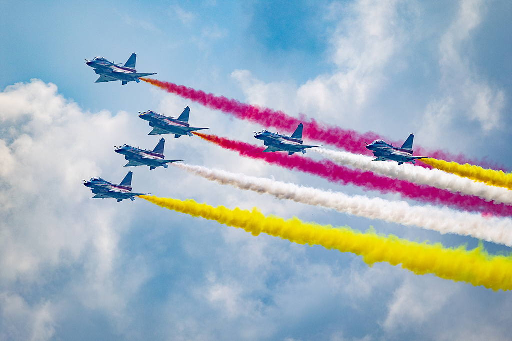 2026年2月1日,應(yīng)邀參加第十屆新加坡航展的中國空軍八一飛行表演隊(duì)在新加坡樟宜機(jī)場進(jìn)行檢驗(yàn)飛行訓(xùn)練,為正式飛行表演做準(zhǔn)備。當(dāng)天11時許,6架殲-10表演機(jī)在樟宜機(jī)場停機(jī)坪分2批依次起飛,在空中集合編組后,飛往海面上空,展開空中特技動作飛行。抵達(dá)訓(xùn)練空域后,6架殲-10表演機(jī)以超密集編隊(duì)低空通場,在空中留下紅、黃、白3色的6道彩煙。隨后,大坡度盤旋、上升轉(zhuǎn)彎、同步橫滾等特技動作有序展開,飛行整齊劃一、銜接緊密,有效檢驗(yàn)了飛行員技戰(zhàn)術(shù)水平和飛機(jī)良好機(jī)動性能。