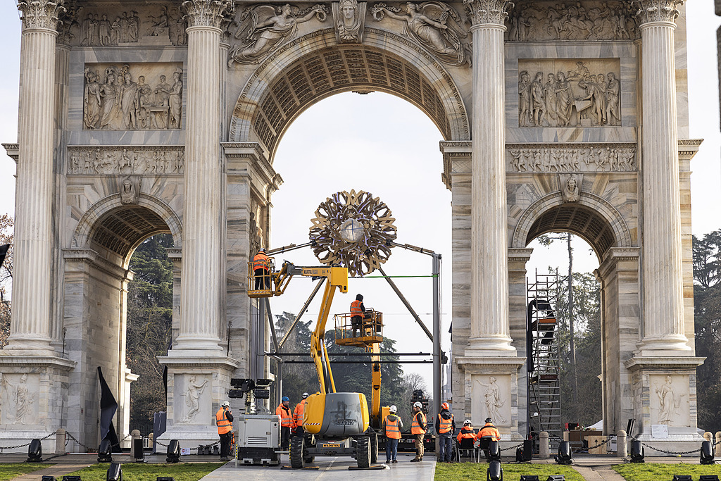當(dāng)?shù)貢r間2026年1月30日,意大利米蘭,建筑工人在和平之門前進(jìn)行奧運(yùn)火炬臺的施工工作。