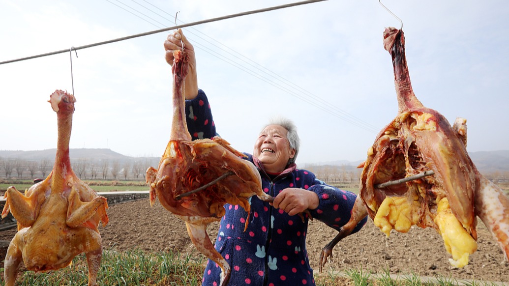 2026年1月27日,湖北十堰市房縣軍店鎮(zhèn)軍馬村農(nóng)民晾曬土雞,置辦年貨。視覺中國 圖