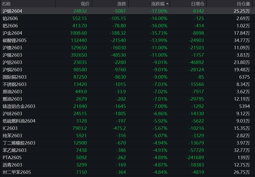 2月2日午后,國內期貨市場有超過10個期貨品種主力合約封住或觸及跌停,涉及黃金、白銀、鉑、鈀、銅、鋁、鎳、原油、碳酸鋰等。