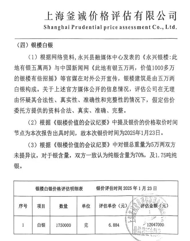 湖南鑫達(dá)上傳平臺的一份價格評估報告書還稱,根據(jù)永興縣融媒體中心發(fā)表的《永興銀樓:此地有銀五萬兩》與中國新聞網(wǎng)《此地有銀五萬兩,價值1000多萬的銀樓有些招搖》等媒體在對外公開宣傳,銀樓建筑是由5萬兩白銀構(gòu)成。評估報告書稱還稱,根據(jù)《銀樓價值的會議紀(jì)要》,本次銀價取價時間為2025年1月23日。對銀總重量為5萬兩未提異議,對于銀含量一致認(rèn)為純銀含量為70%,即5萬兩(2.5噸)銀中含純銀1.75噸,評估單價為純銀6.884元/克。