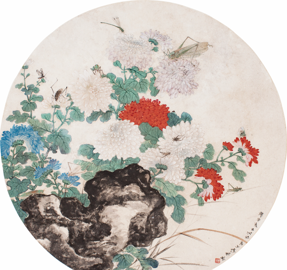 展覽中的《秋菊蟲趣圖》以圓形鏡片呈現(xiàn),設(shè)色清雅,秋菊的雋秀與蟲豸的靈動(dòng)相互映襯,盡顯早期工筆的精研富麗。而1946年創(chuàng)作的《百樂(lè)圖》則筆墨縱意揮灑,色彩明艷靈動(dòng),線條遒勁有力,完美展現(xiàn)了他“書法入畫”的藝術(shù)追求。