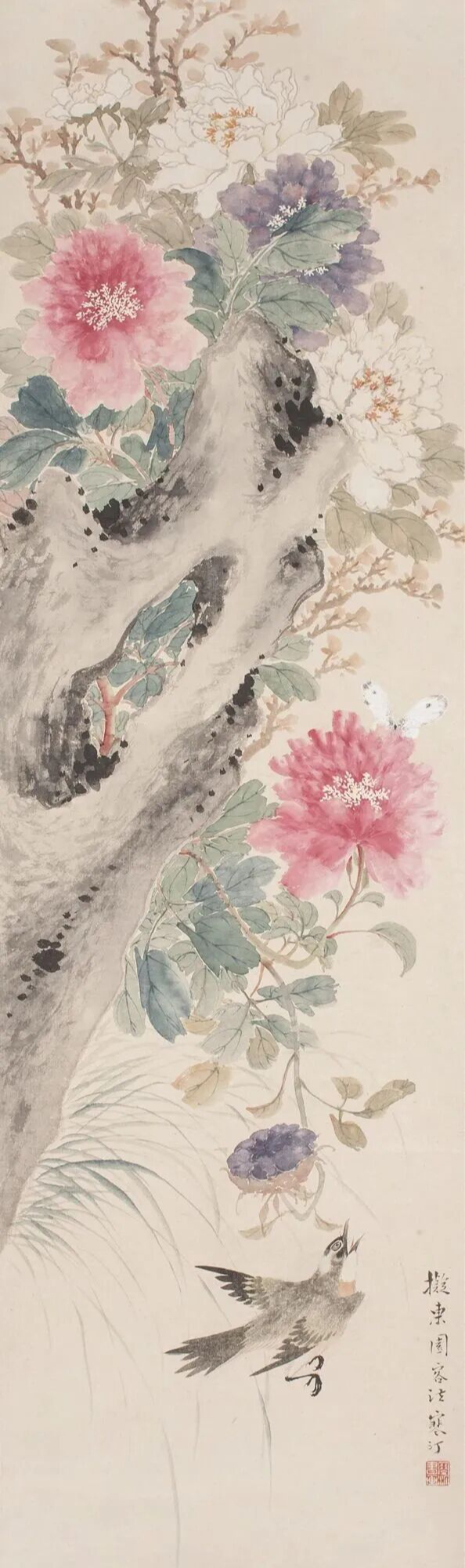 江寒汀(1903—1963),原名荻,字寒汀,江蘇常熟人,其藝術(shù)上溯宋元,下追明清,尤以嫻熟的雙鉤填彩和沒(méi)骨寫生技法著稱,臨摹虛谷作品幾可亂真,故有“江虛谷”之稱。筆下禽鳥形態(tài)生動(dòng)、設(shè)色清雅,有“寒汀筆下鳥,天下到處飛”之譽(yù)。展出的《古柏八哥》《富貴白頭》等作品中,我們既可見(jiàn)惲南田的遺風(fēng),更能感受到畫家個(gè)人的才情與創(chuàng)新。