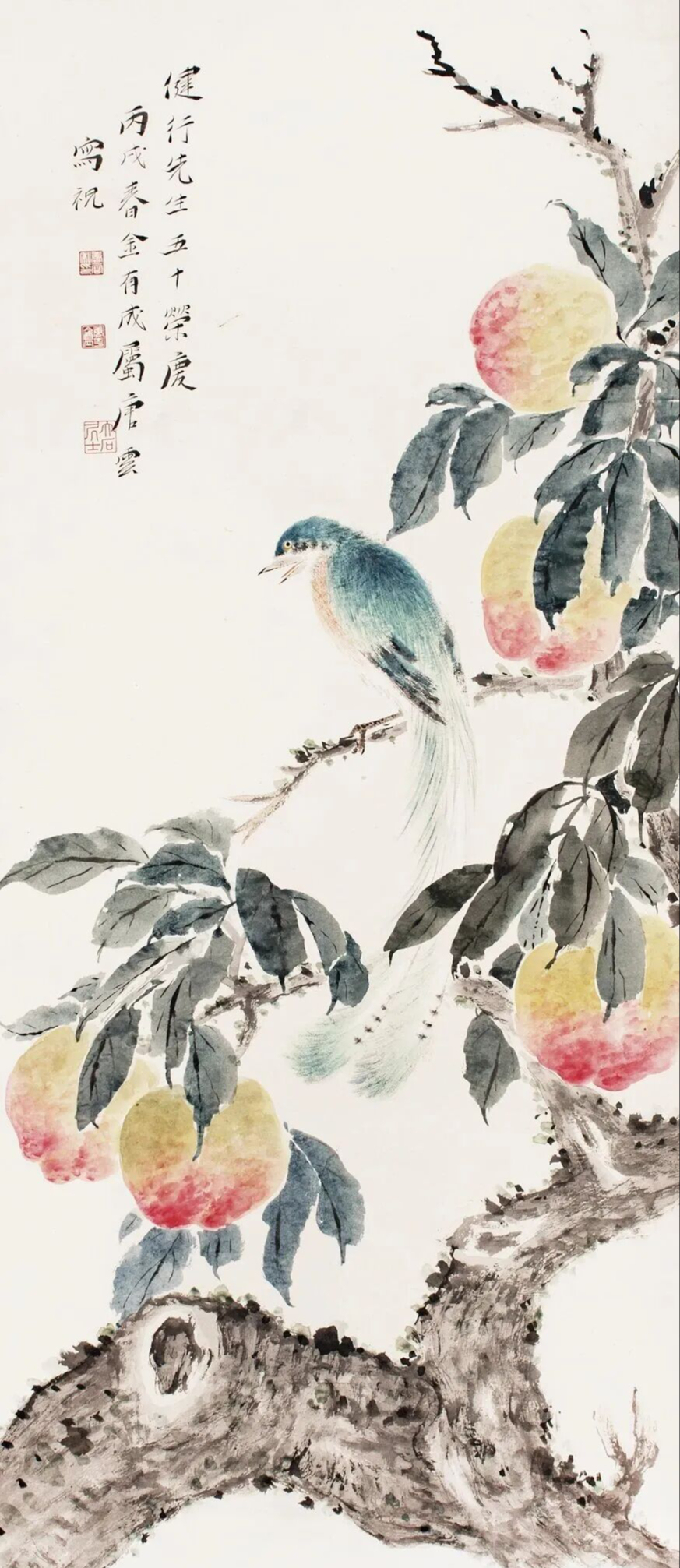 唐云(1910—1993),字俠塵,號(hào)藥城、大石翁,浙江杭州人。1960年任上海中國(guó)畫院業(yè)務(wù)室主任。其藝術(shù)博采眾長(zhǎng),融華新羅之清新、金冬心之古拙、八大山人之凝練于一體,在傳統(tǒng)文人畫中注入現(xiàn)代審美意識(shí),形成了清新俊逸、雅俗共賞的獨(dú)特風(fēng)格。展覽中,1946年他為上海朵云軒創(chuàng)始人丁健行所作的《五壽圖》,以傳統(tǒng)吉祥題材為載體,筆墨酣暢淋漓,設(shè)色明快典雅,在傳統(tǒng)中寄托著時(shí)代的美好祝福。1943年的《桃柳鴛鴦》擬華新羅筆意,構(gòu)圖奇崛,“桃柳鴛鴦爭(zhēng)好春,落花蝴蝶迷芳草”的題跋與畫面相映成趣,盡顯清新俊逸之風(fēng)。