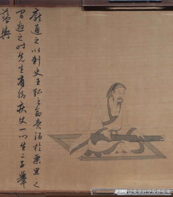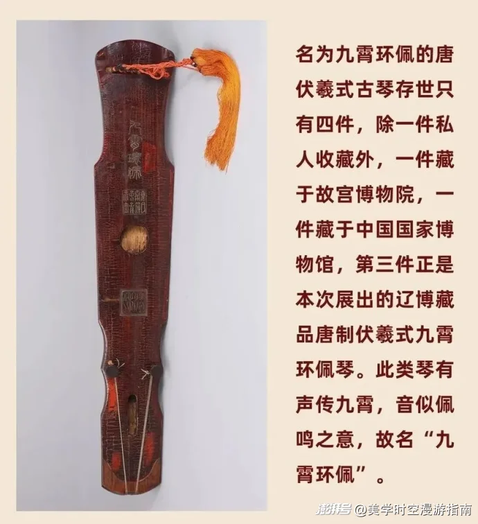位于遼博一樓的“髹兮——元明清漆器精品展”上,在展廳的結(jié)尾,進(jìn)門(mén)右轉(zhuǎn)可見(jiàn)。伏羲式,漆木制,紫檀岳尾。底部圓形龍池上方陰刻篆體“九霄環(huán)佩”四字琴名,龍池下方刻“清和”二篆字寬邊方印。(注意在展現(xiàn)現(xiàn)場(chǎng)需要蹲下看底部)?!熬畔霏h(huán)佩”是古琴中的精品,為盛唐開(kāi)元年間四川制琴世家雷氏制作,也是唐玄宗三子繼位大典上使用的樂(lè)器。(該展覽結(jié)束日期:2026年3月30日)