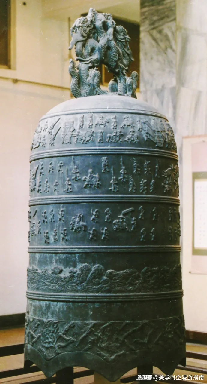 位于遼博三樓古代遼寧的“遼金展廳”。鐘身銘文“大宋崇寧三年”與《周頌清廟之什圖卷》“宗廟禮樂(lè)”同一主題;鐘體刻鹵簿儀仗,也可與《虢國(guó)夫人游春圖》“鞍馬儀仗”對(duì)照觀賞。