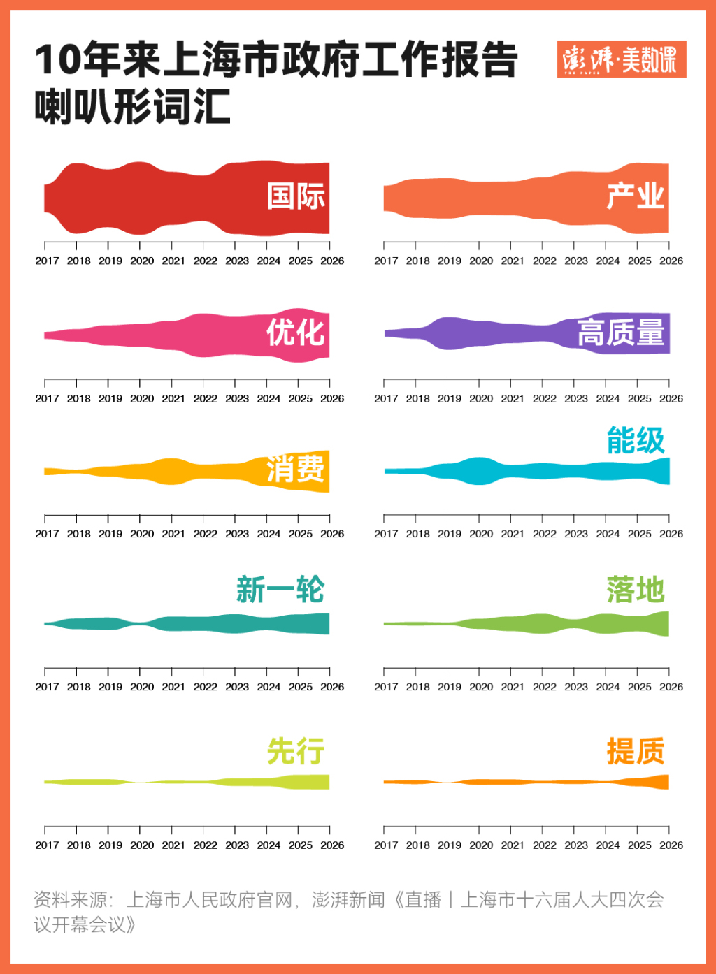 還有部分詞匯在過去十年更頻繁地出現(xiàn)在《上海市政府工作報告》中,比如“落地”“優(yōu)化”“消費”“高質(zhì)量”。這些詞在逐年對比后呈現(xiàn)出明顯的增長趨勢,澎湃新聞將此類詞語稱為“喇叭形詞語”。