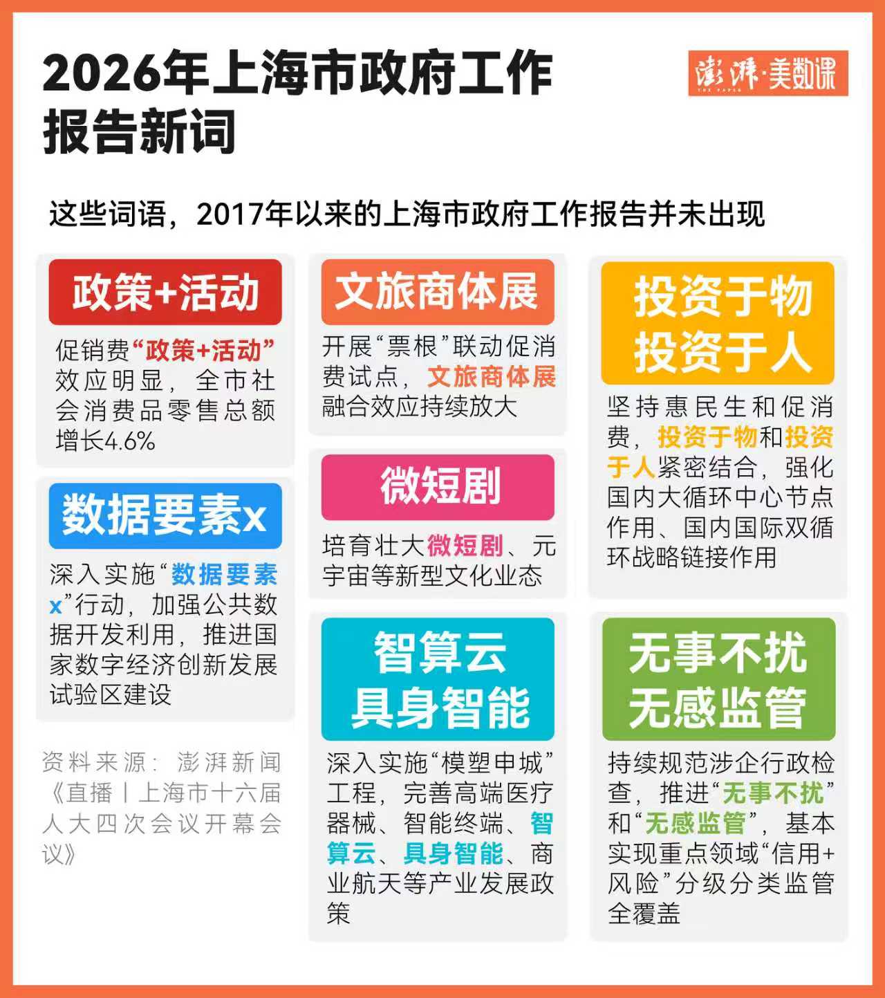 在2026年《上海市政府工作報告》中,還出現(xiàn)了過去10年未曾提及的詞語,例如“文旅商體展”“數(shù)據(jù)要素x”“微短劇”“具身智能”等。