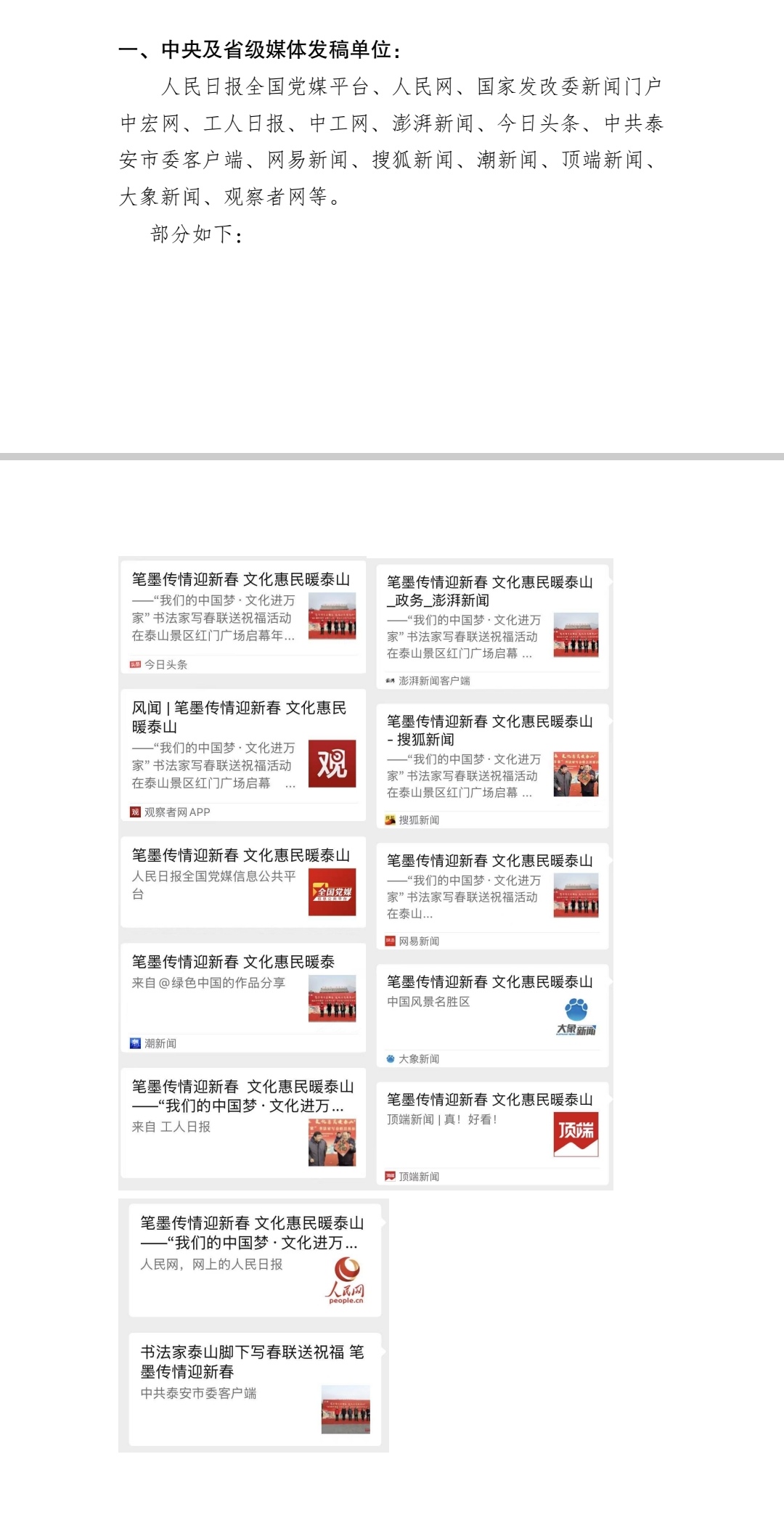 據(jù)不完全統(tǒng)計,截至1月30日,活動相關(guān)新聞在人民日報全國黨媒平臺、人民網(wǎng)、國家發(fā)改委中宏網(wǎng)、工人日報、澎湃新聞等中央及核心主流媒體,以及今日頭條、網(wǎng)易新聞、搜狐新聞等主流商業(yè)平臺廣泛傳播。地方媒體中,中共泰安市委客戶端、齊魯晚報·齊魯壹點等也進(jìn)行了全面報道,活動總曝光量約7518萬,總瀏覽量約582萬,形成了廣泛的社會影響。