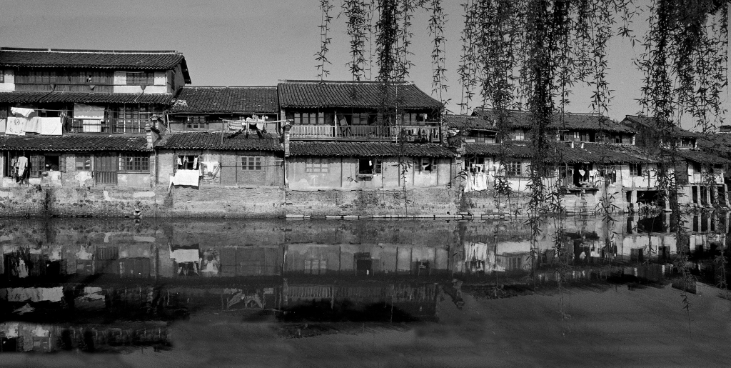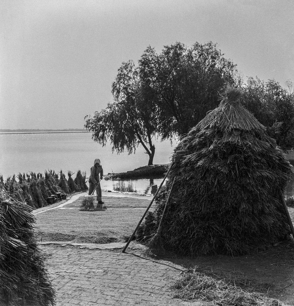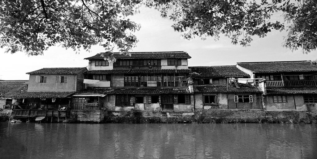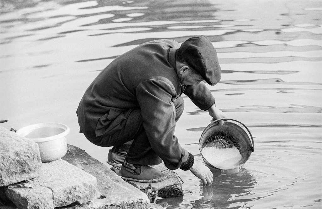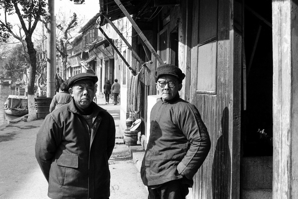 馮念康生長在七寶,拍七寶于他是自然而然的事。這些照片以風(fēng)景居多,黑白膠片展現(xiàn)了1970年代蒲匯塘兩岸的水鄉(xiāng)風(fēng)貌。“我?;貞浧鹌褏R塘兩岸出來倒馬桶的人,一到下雨,很多人淋著雨在河邊拉網(wǎng)抓魚,農(nóng)村里出來的老頭,拎著一籃子菜,到岸邊擺下一個攤位,便泡一壺茶,自顧自地喝著。那種景象,再也拍不到了?!瘪T念康說。他早年這些無意的攝影活動,使得留存下來的這批影像于今天的閔行七寶無比珍貴。