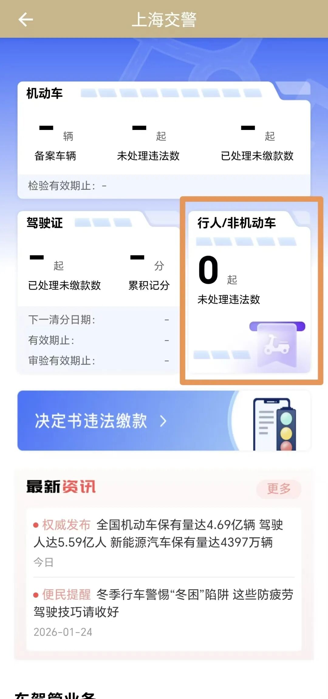 查詢指南:打開登錄“隨申辦市民云”APP,首頁搜索交警專區(qū)點(diǎn)擊進(jìn)入服務(wù)后,在首頁面找到“行人/非機(jī)動(dòng)車”卡片,即可查詢。