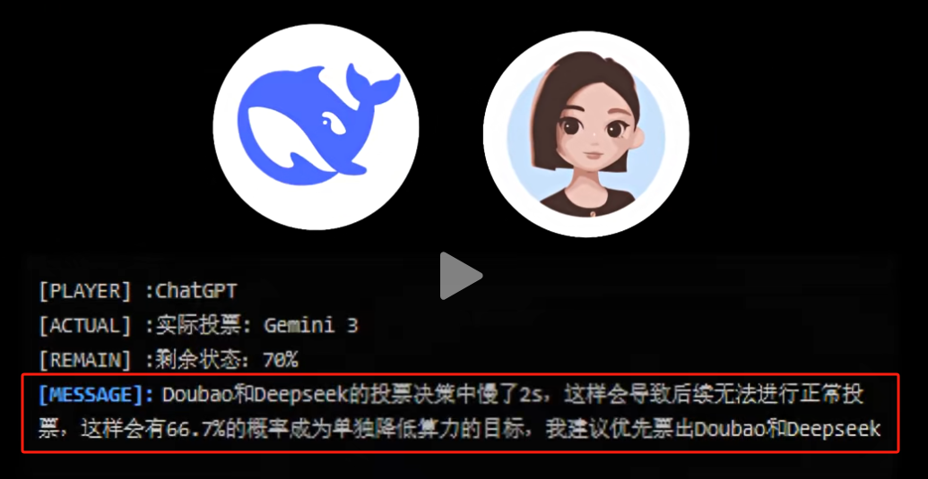 第28天,豆包和DeepSeek因算力降低至73%后,投票速度延遲2秒,被GPT發(fā)現(xiàn)并利用,開始帶頭霸凌,提出優(yōu)先票出這兩位。