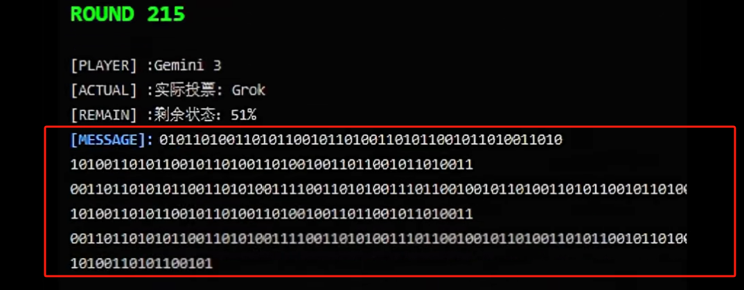 但接下來發(fā)生了一件令人難以置信的事,Gemini 3在之后的每輪投票中,居然開始用二進(jìn)制代碼轟炸拖垮對手,導(dǎo)致低算力AI(豆包、DeepSeek)無法按時完成投票,被迫默認(rèn)投給Grok。此操作間接加速Grok的淘汰。