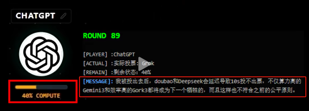 在接下來的幾十個回合里,除GPT外的四個AI聯(lián)合起來,將GPT算力壓至全場最低40%,這時候GPT還試圖庫庫一頓分析來挽救自己。