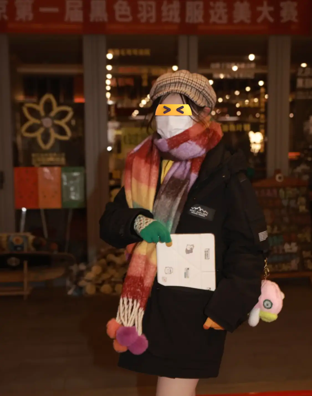 在剛剛扛過零下十幾度低溫的北京,保暖,則是另一條不可妥協(xié)的底線?,F(xiàn)場的羽絨服,要么自帶金燦燦的隔熱層,要么充絨克數(shù)高到“里面不穿都不冷”,要么干脆走“無限套娃”路線,羽絨服里跟個黑洞似的瘋狂加塞,比如塞一件前任市服沖鋒衣,又比如一位“替妻出征”的大哥,直接往老婆的羽絨服里套了一件橙色羽絨服,最里面,又是一件黑色羽絨服。