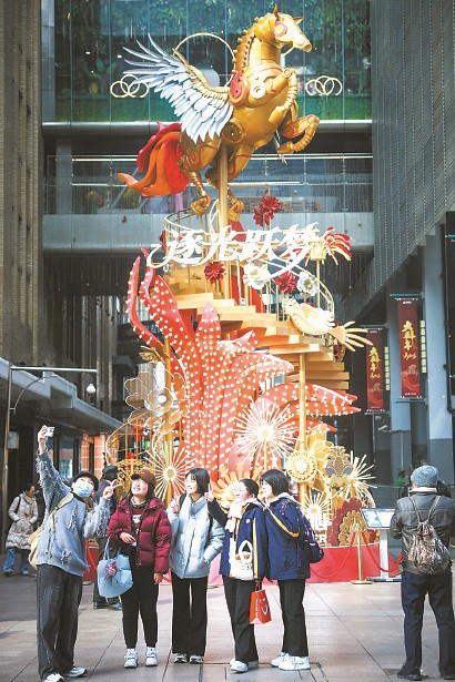 今年的南京路步行街,不僅延續(xù)了經(jīng)典中國(guó)結(jié)的喜慶裝扮,更以“尋馬南京路,新年一路開(kāi)掛向前”為主題,打造了多處別致又有深意的馬年美陳?!霸谶@里停留了很長(zhǎng)時(shí)間,除了購(gòu)物,主要是覺(jué)得拍照特別出片?!币晃粊?lái)自山東的游客沿著南京路慢慢踱步、逐一打卡。