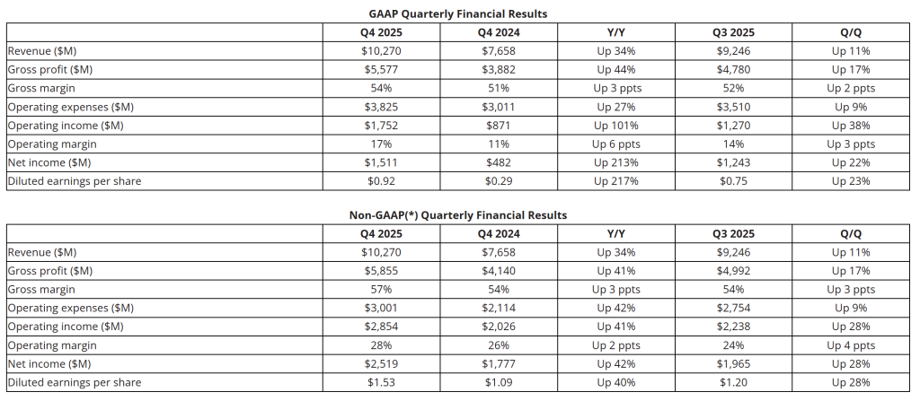 2025年全年,公司營(yíng)收達(dá)到346.39億美元,同比增長(zhǎng)34%,GAAP下凈利潤(rùn)43.35億美元,Non-GAAP下每股攤薄收益4.17美元。