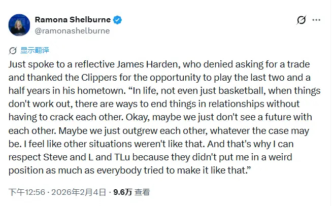 當然,交易達成后,關于“哈登這次到底是不是主動提出交易申請”成了一個爭議話題,ESPN資深記者羅蒙娜·謝爾本(Romona Shelburne)在社交媒體上發(fā)表了一段哈登的表述,稱哈登表示并沒有主動向快船提出“交易申請”,“我不愿成為阻礙快船未來發(fā)展的絆腳石,希望他們能真正獲得重建機會并積累選秀資本。而在克利夫蘭,我看到了東部爭冠的契機,盡管我渴望留在洛杉磯再戰(zhàn),畢竟從未奪冠過,但作為籃球運動員,我認為這里(克利夫蘭)更有機會?!?/p>