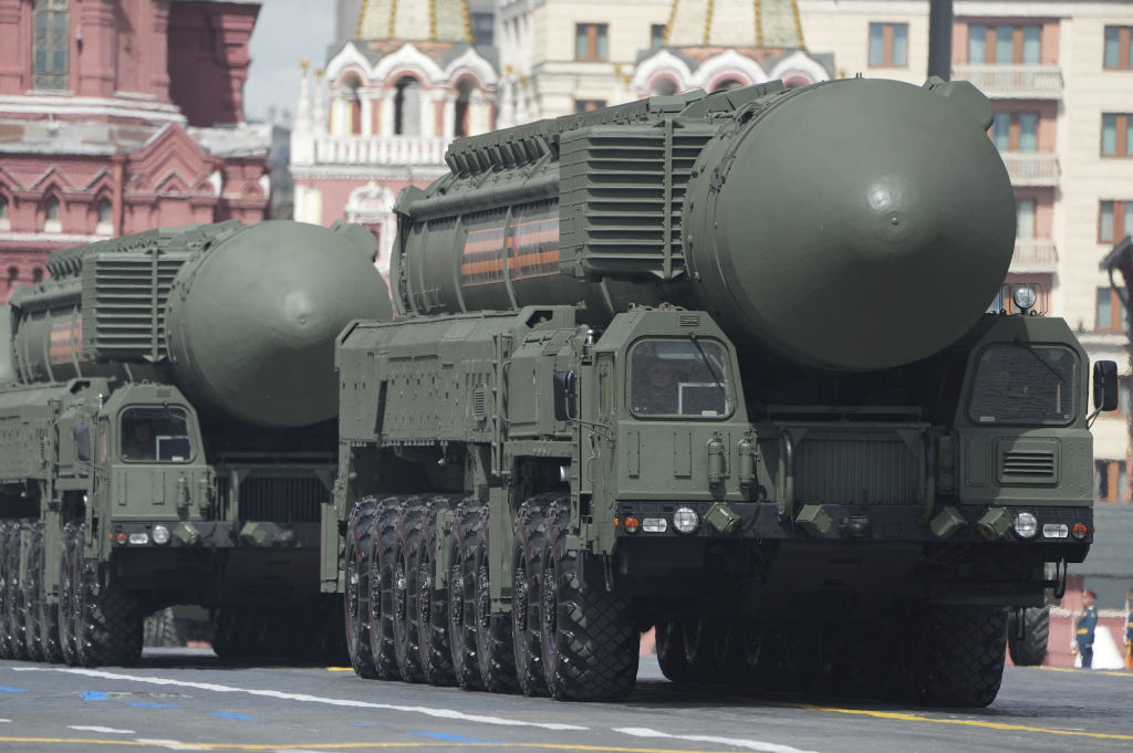 2025年5月9日,在俄羅斯首都莫斯科舉行的紀念蘇聯(lián)偉大衛(wèi)國戰(zhàn)爭勝利80周年閱兵式上拍攝的洲際彈道導彈。新華社記者 賴向東 攝