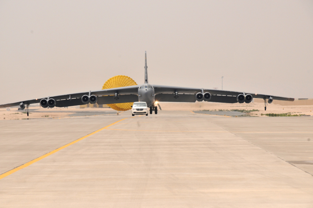 2016年4月9日,一架美國空軍的B-52轟炸機抵達卡塔爾烏代德空軍基地。新華社 圖