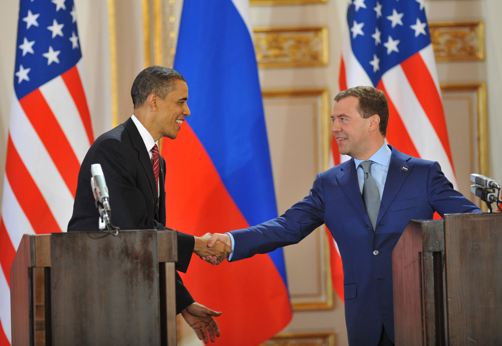 2010年4月8日的資料照片顯示,時任美國總統(tǒng)奧巴馬(左)和時任俄羅斯總統(tǒng)梅德韋杰夫在捷克首都布拉格簽署新核裁軍條約后出席新聞發(fā)布會時握手。 新華社記者 武巍 攝