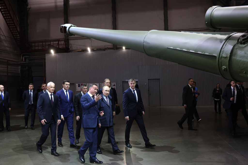 當?shù)貢r間2025年9月19日,俄羅斯彼爾姆,俄羅斯總統(tǒng)普京在軍事工業(yè)公司莫托維利哈參觀武器展。視覺中國 圖