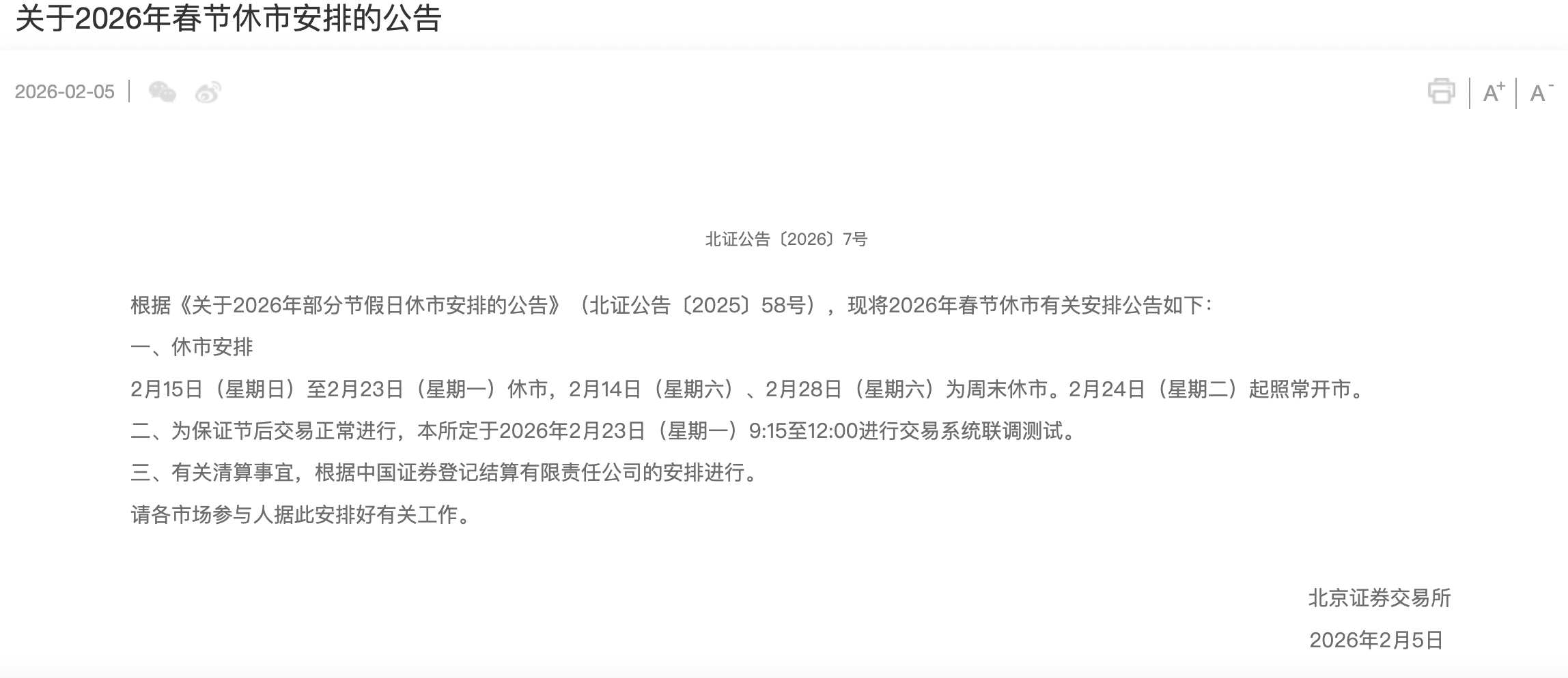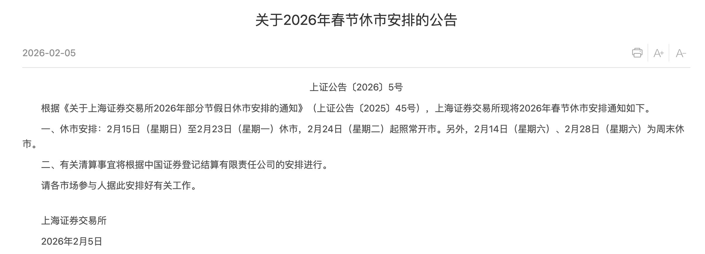 2月5日,上海證券交易所、深圳證券交易所和北京證券交易所同步發(fā)布2026年春節(jié)休市安排的公告。