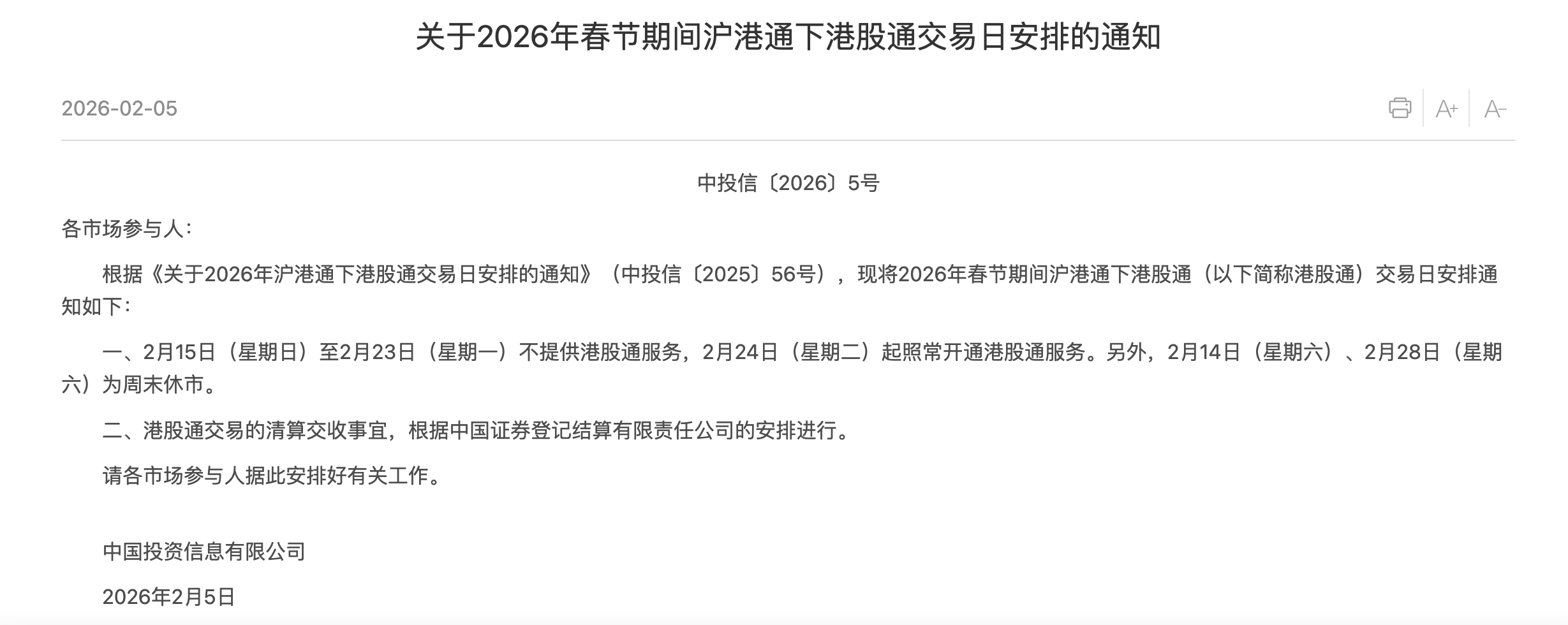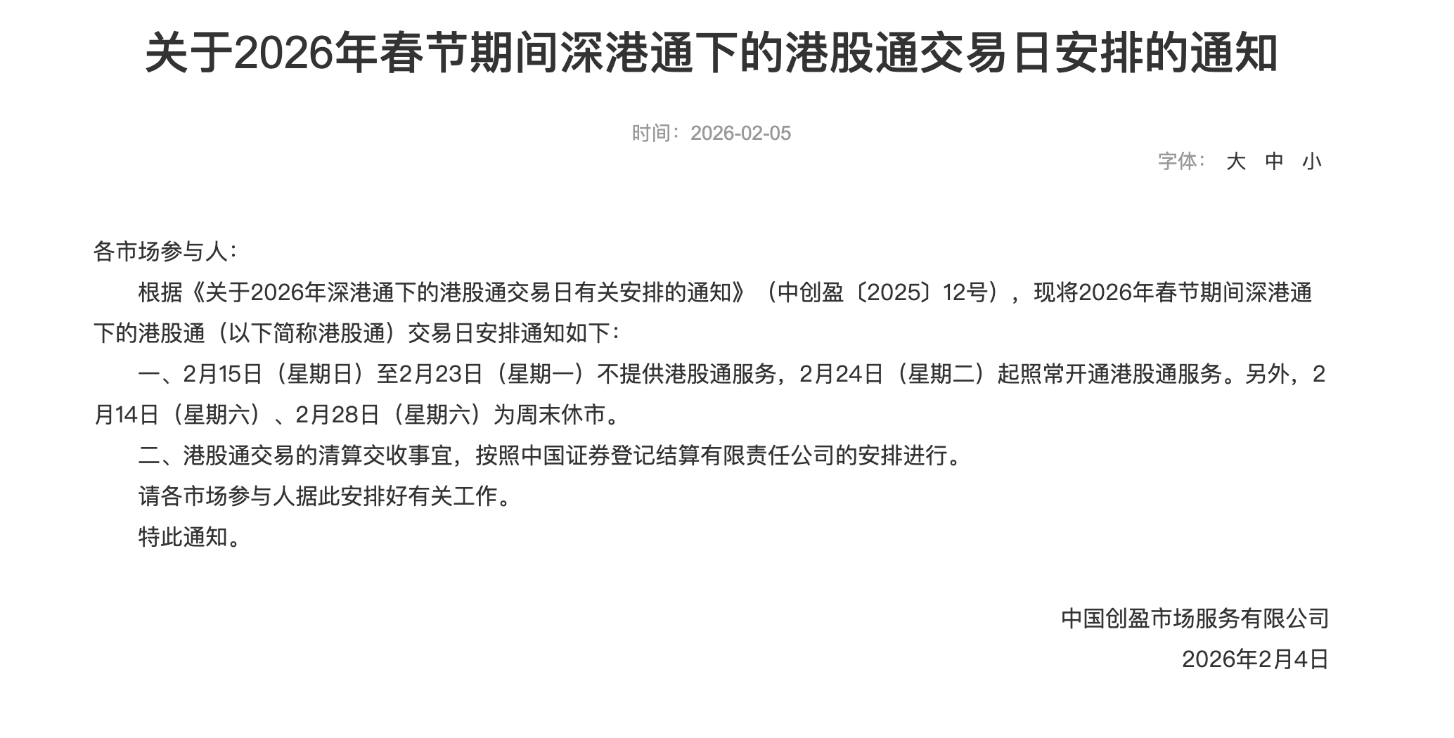 此外,滬深交易所還發(fā)布了2026年春節(jié)期間滬深港通下港股通交易日安排的通知。