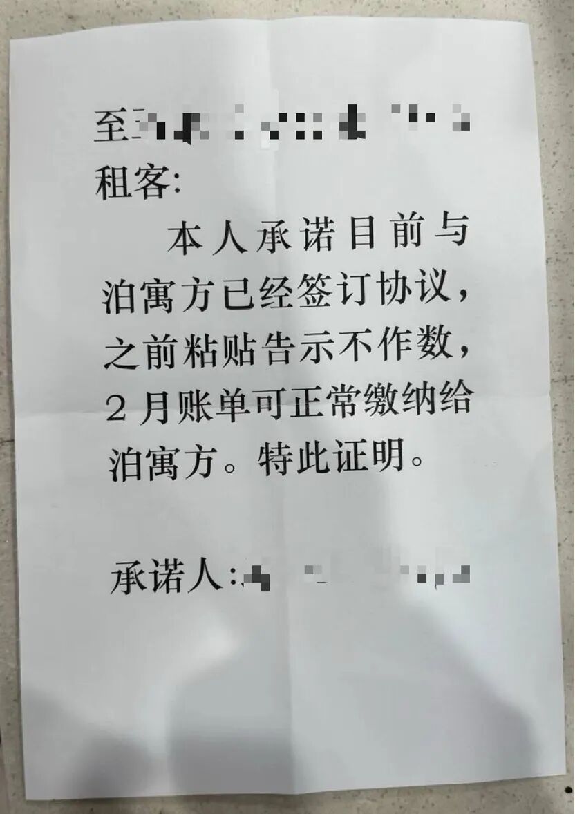 1月28日,或許是帖子引起的連鎖反應(yīng),泊寓工作人員約他和幾位群友在大堂,當(dāng)面告知他們,已經(jīng)和房東協(xié)商好相關(guān)事宜,一切照常運(yùn)轉(zhuǎn)。2月3日,他們收到房東的聲明,有人拍照發(fā)到群里,房東承諾已經(jīng)與泊寓方簽訂協(xié)議,2月賬單可以正常繳納給平臺(tái)。