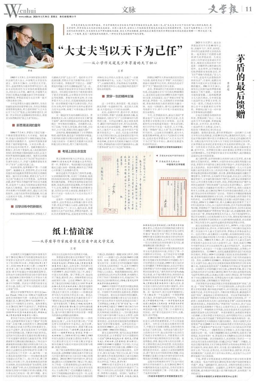 本報特約三篇文章,嘗試從三個切面探尋茅盾先生深邃而遼闊的精神世界。它始于烏鎮(zhèn)考場上一個少年與時代的鄭重締約,行至國際交往中那雙敏銳而溫暖、堅定又開放的眼睛,最終抵達后圓恩寺胡同里那份沉靜而深遠的最后饋贈——那不僅是一筆基金、一個獎項,更是一道跨越世紀的提問,一種對文學(xué)未來的持續(xù)叩詢與召喚。