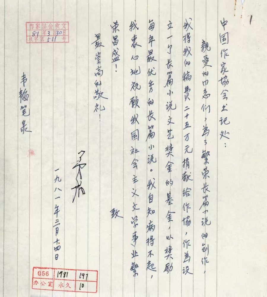 茅盾逝世前致中國作協(xié)的信,中國現(xiàn)代文學(xué)館藏