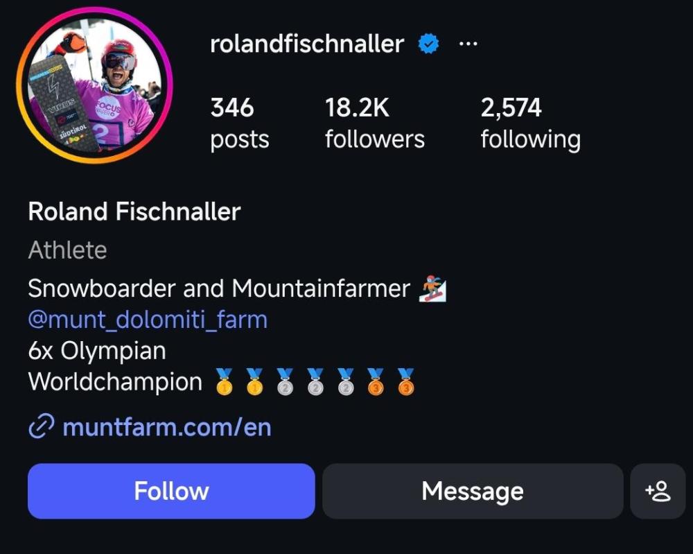 “放牛老哥”并不是一句玩笑,而是一份正經(jīng)的工作。在自己的個人社交賬號主頁上,菲施納勒這樣介紹自己:“Snowboarder and Mountainfarmer”。前面的snowboarder不難理解——單板滑雪運(yùn)動員;而所謂“mountainfarmer”,是阿爾卑斯山區(qū)常見的一種職業(yè),指長期在山區(qū)從事農(nóng)牧業(yè)及相關(guān)經(jīng)營的人,俗稱“山地農(nóng)牧民”。