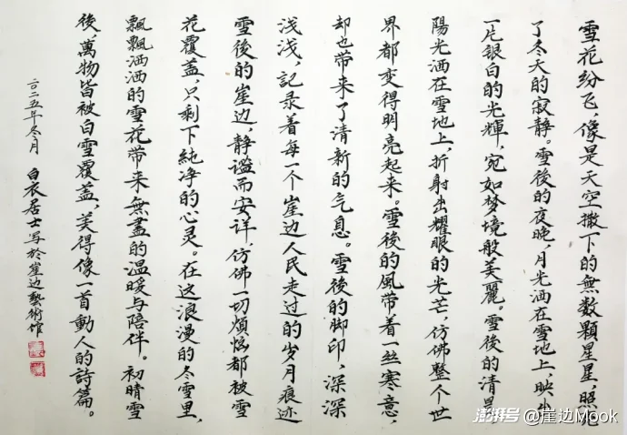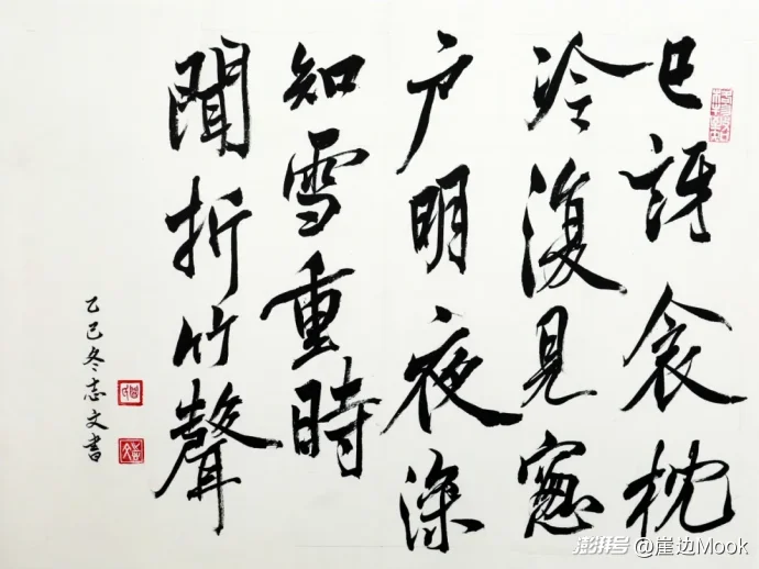 此幅行書筆墨書寫白居易《夜雪》,通過“衾枕冷”、“夜深”、“折竹聲”等意象,將雪夜的清寂與文人的靜思凝于紙上,盡顯書法與詩歌意境的完美交融。——閆志文
