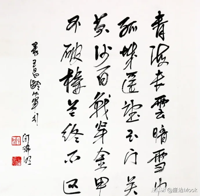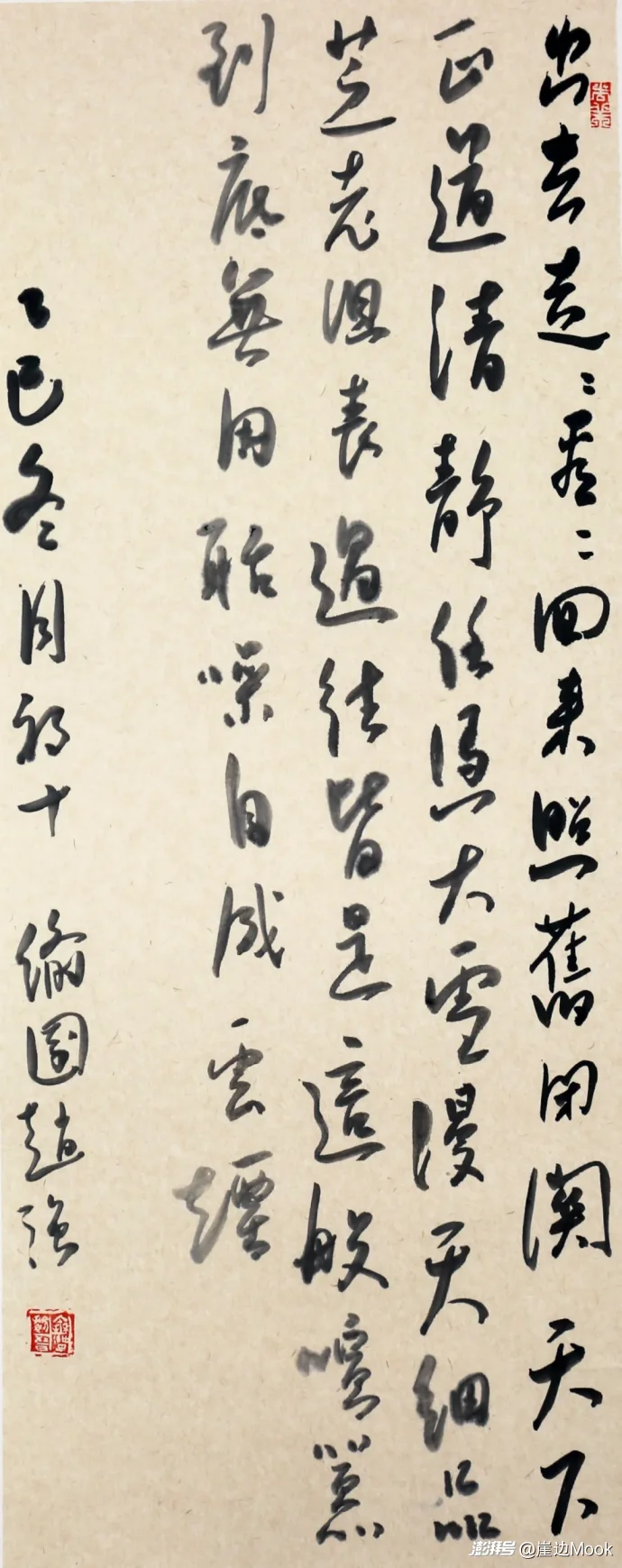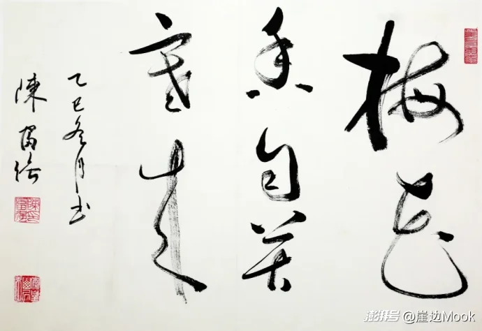 海門瘦月、潮吼白沙的蒼勁,與閑看梅花的野逸,在狂草中相遇。我以連綿的筆勢與飛白的渴筆,捕捉潮聲的節(jié)奏與梅枝的峭拔,讓詩中的清冷孤傲在墨色奔流中自由生長。