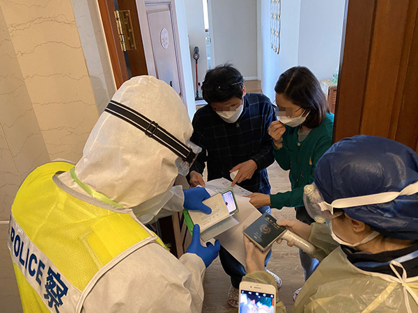 “你們好,戴一下口罩,我們是社區(qū)的,需要向你們了解一下情況。”在韓語志愿者的幫助下,社區(qū)干部了解到這家的丈夫2月1日就已經(jīng)回到了上海,但由于妻子的返滬,如今要和妻子一起進行居家隔離。