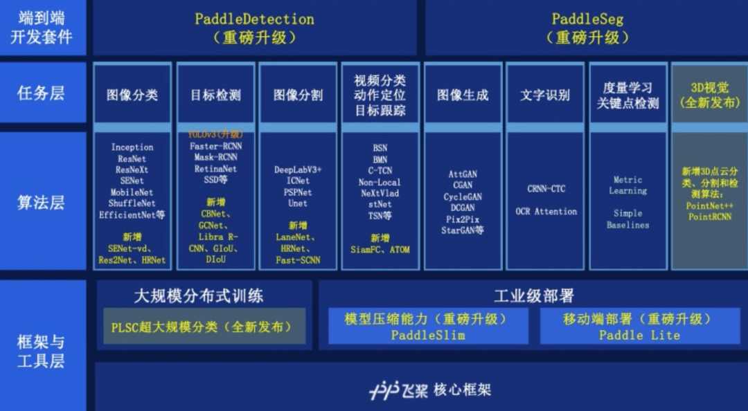 PaddleCV全景圖首度曝光,其底層框架與工具層得到了工業(yè)級提升,這種提升面向的是當下工業(yè)領(lǐng)域訴求。