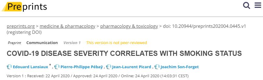 最近對中國和美國的篩選出潛在的健康狀況的的COVID-19患者,經過初步估計表明,有潛在健康問題的個體更容易感染嚴重的COVID-19。最近俄羅斯的流行病學回顧表明,吸煙很可能對COVID-19的負性進展與不良結果有關,與此同時,病理生理學研究已經提出了一種假設:ACE抑制劑/血管緊張素Ⅱ受體阻滯劑和尼古丁在COVID-19感染患者中是有效的。