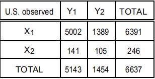 研究人員使用零假設(H0),就是兩個變量的正相交性:吸煙狀況(X)和COVID-19癥狀嚴重程度(Y)。每個變量都有兩個值:吸煙狀況(X),絕不吸煙者(X1)或當前/過去的吸煙者(X2);對于COVID-19癥狀的嚴重程度(Y),是輕度(未住院)(Y1)或重度(住院,ICU或非ICU)(Y2)癥狀嚴重程度。